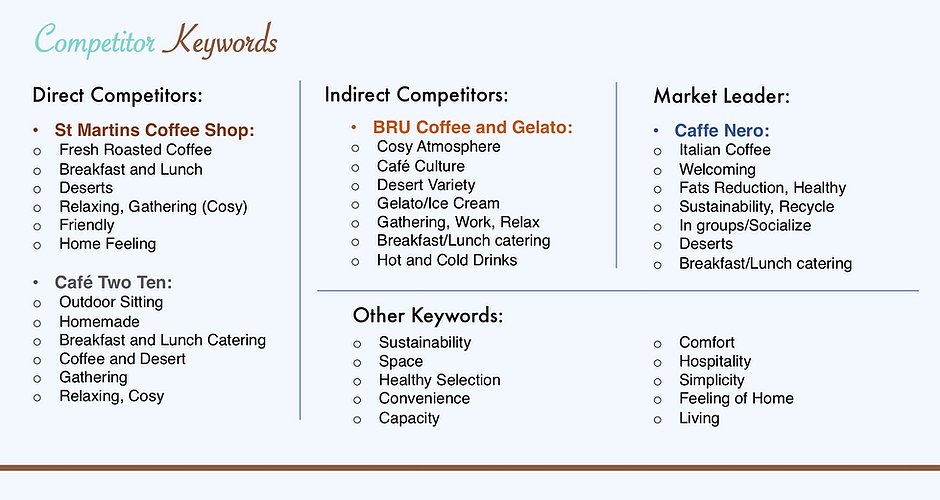 The selected aspects within the Brand Guidelines were all determined by the research on the Keywords and Key Products of the focused brand, their customer profile, and the average image on the mentioned competitors within the Restaurant/Cafe industry.