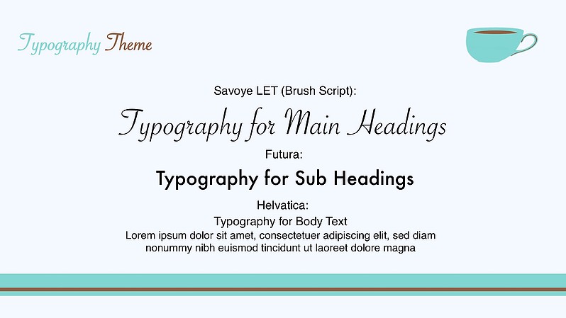 The Brand value of Tea, Cosy, Warm and Welcoming, and Evolving Classic have determined the visual aspects of the brand, which includes the colour, typography and photography. The selected colours were Turquoise Green, Light Blue, and Brown, and the selected typography fonts were Brush Script (Savoye LET), Futura, and Helvetica.